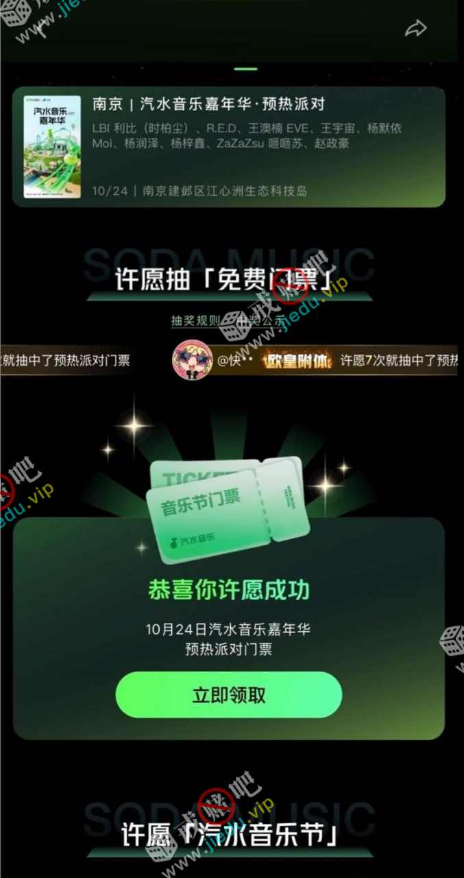抖音关联音乐应用汽水音乐,可以在应用商店或者通过抖音下载,点福利-音乐节-去许愿门票,右滑到底有两个南京的去许愿,抽中了可以去悬赏平台或闲鱼出,价格130+