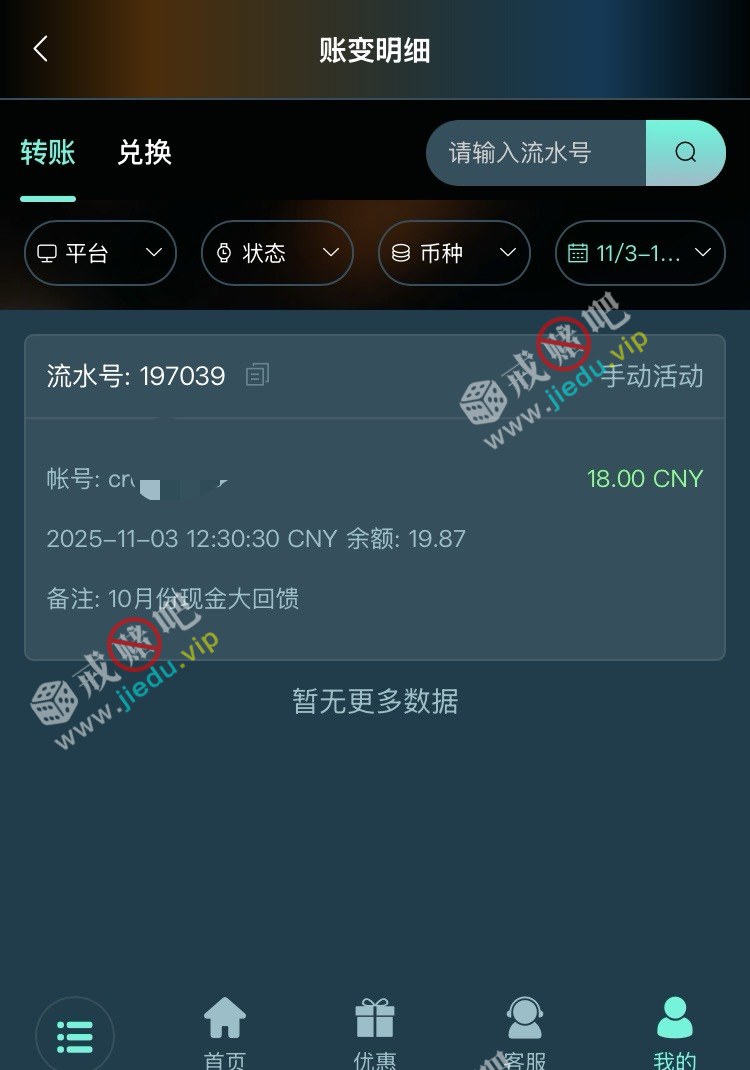 幻影收到10月份回馈彩金,有号的去看看。
