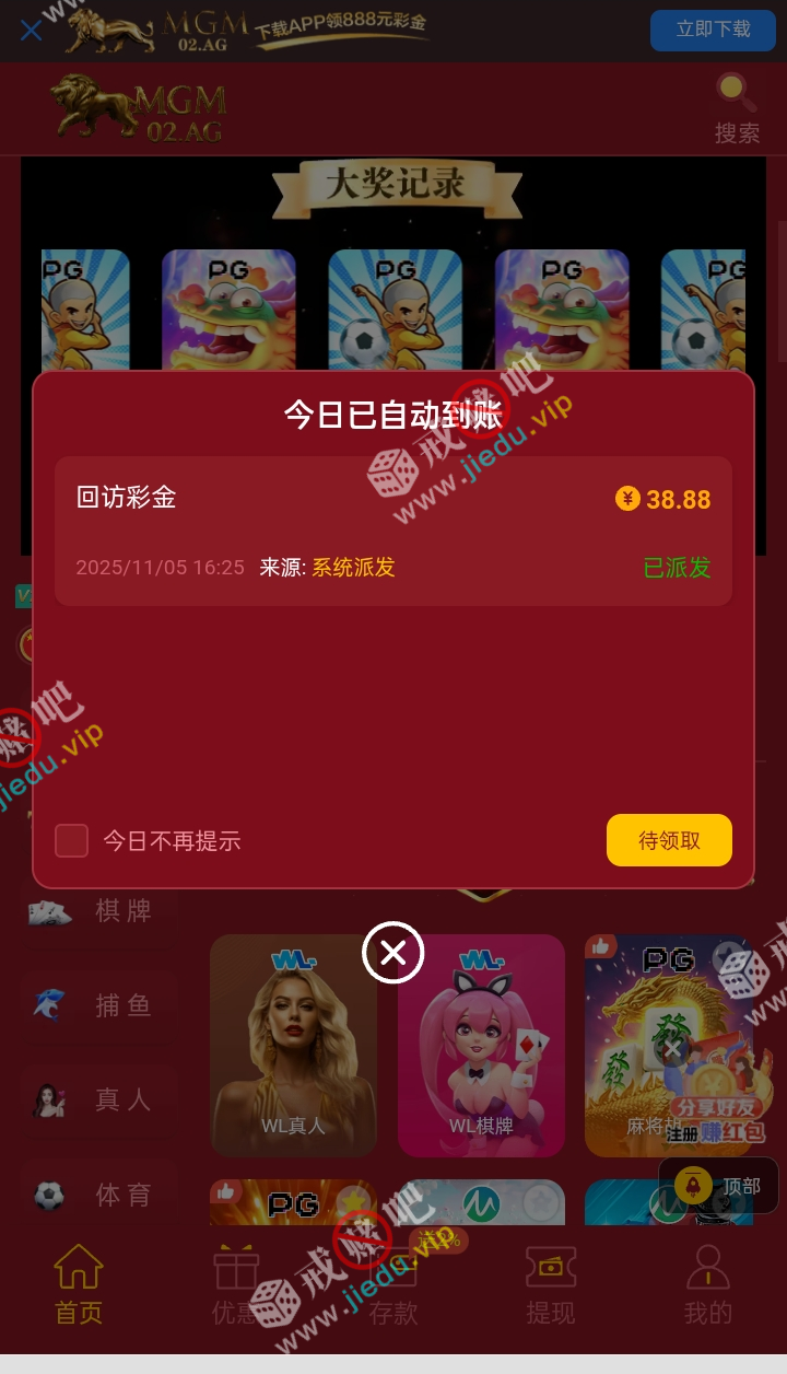 碰瓷回访彩金,这台经常送的。