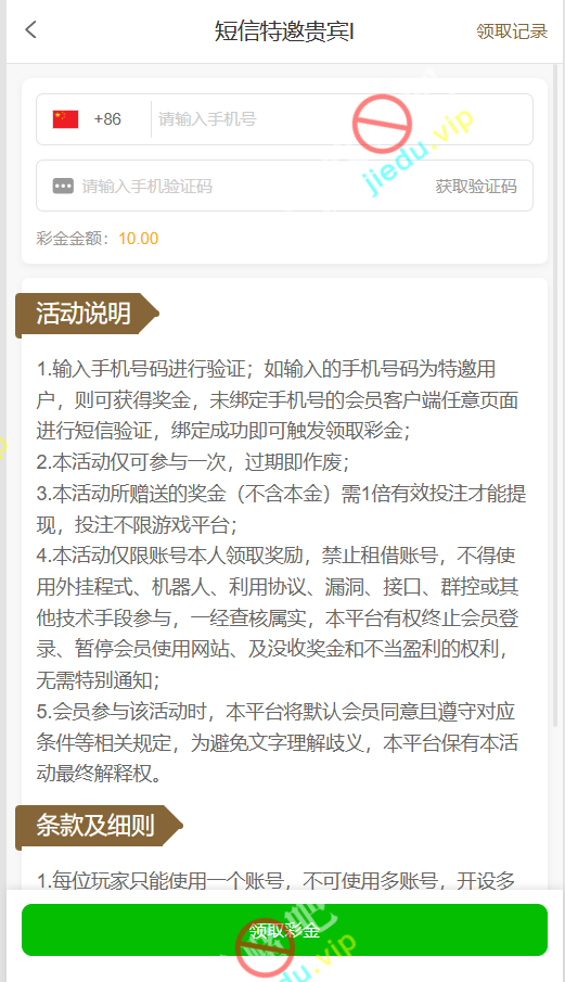 验证手机号领取 10 块彩金。
