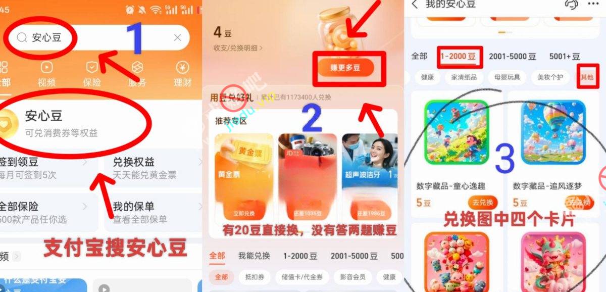支付宝搜索“安心豆”按图中步骤领取四个卡片,每天可领4个,最多领20个卡片,可以领5天。变现可以去闲鱼卖价格合适就出反正几包烟水钱是有的。看图操作哦老哥们。