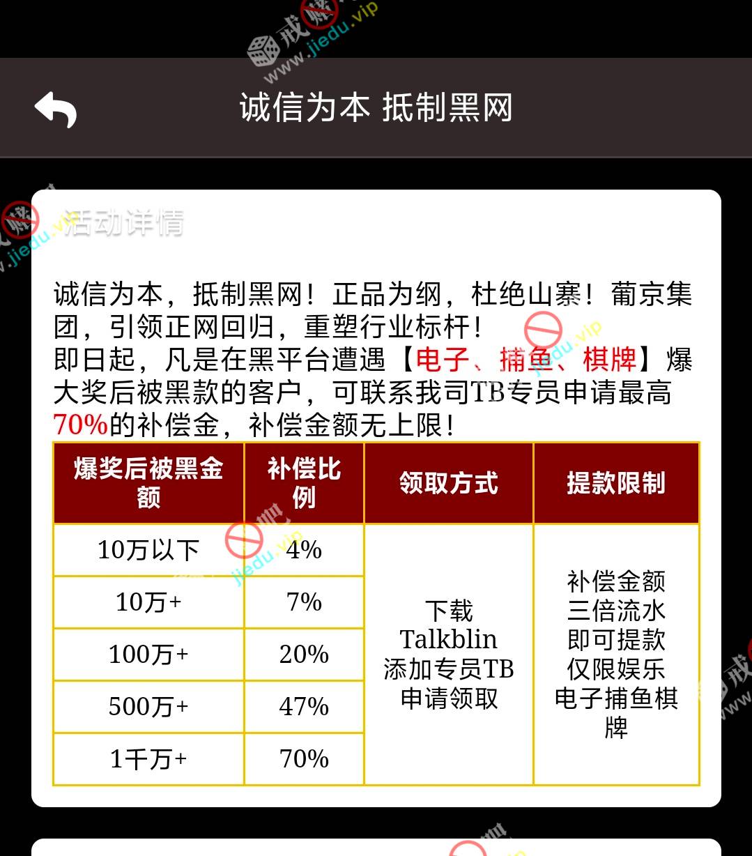 这里有个活动,来这边能领取被黑金额的一部分彩金,昨天有个人被黑五万八,找客服送了4%就是2320彩金,打到4000多提现了,有被黑的可以来试试,反正被黑了那些钱也没用了