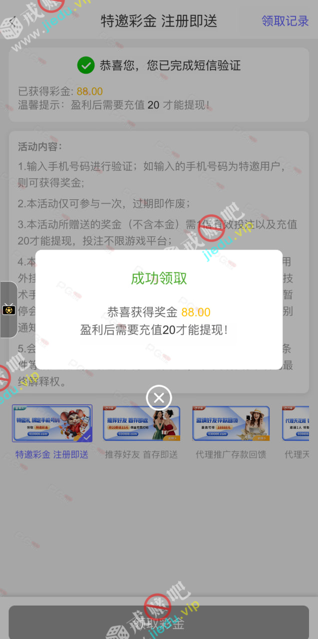 我接到电话让我注册领彩金,送了 88,没接到电话的直接输入手机号试试看,因为我另一个号也领到了 28,金额是随机。