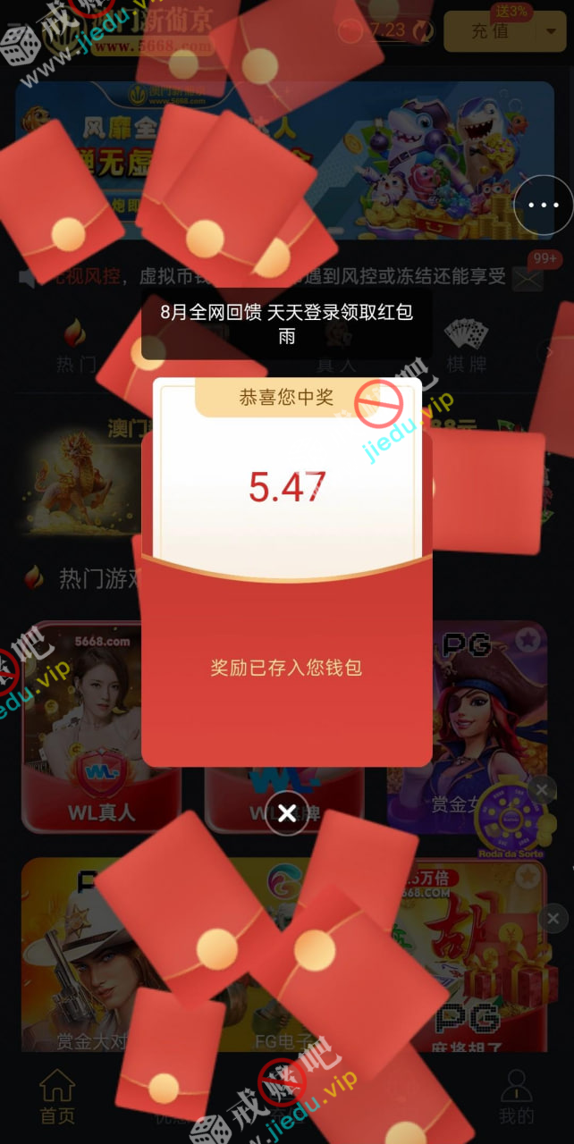 有历史充值的,8月5号之前,每天三次免费抢红包,三次加起来有20块左右。