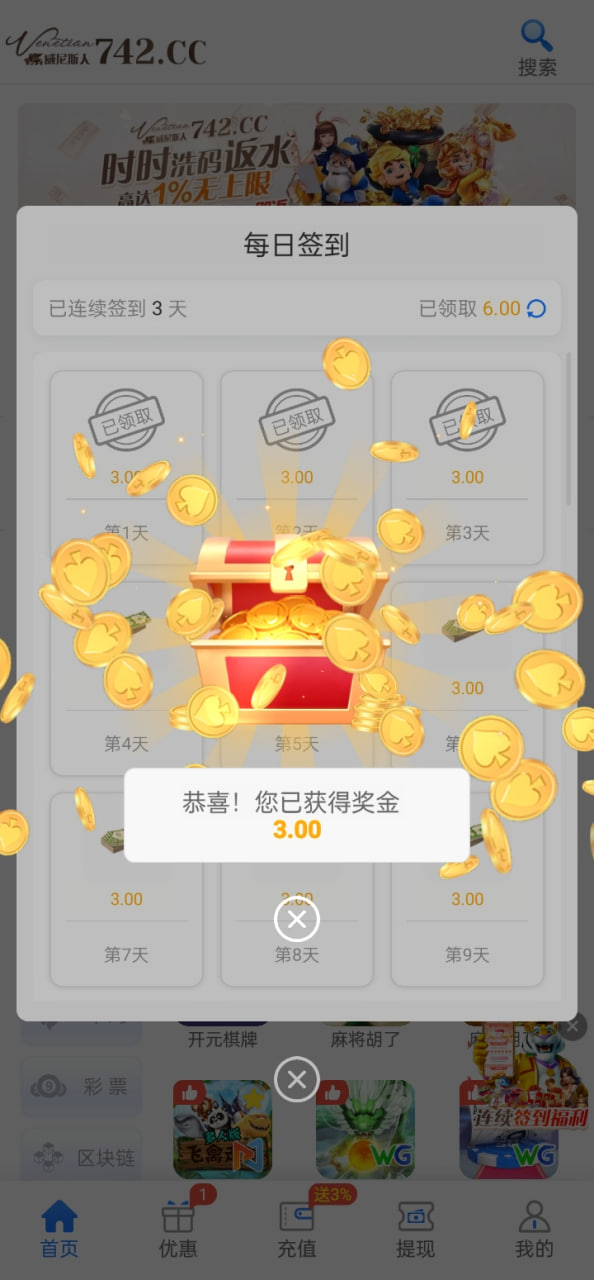 这个742我只充值了一次,好像每天可以领彩金的,搞不懂。又可以开赌神项目了