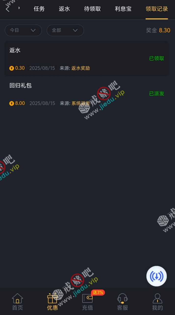 很久没登录的去看看,我登录就送了 8 块的回归礼金。