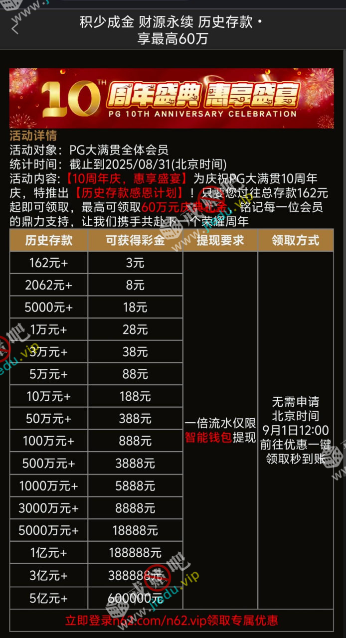 PG大满贯N62历史存款大回馈!有号充值过的朋友可以看看