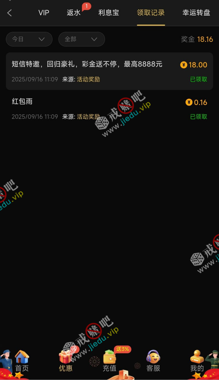 现在新出的短信回归彩金,之前领过特邀自助9 块的宝们,估计这个也会有吧,去碰碰下!