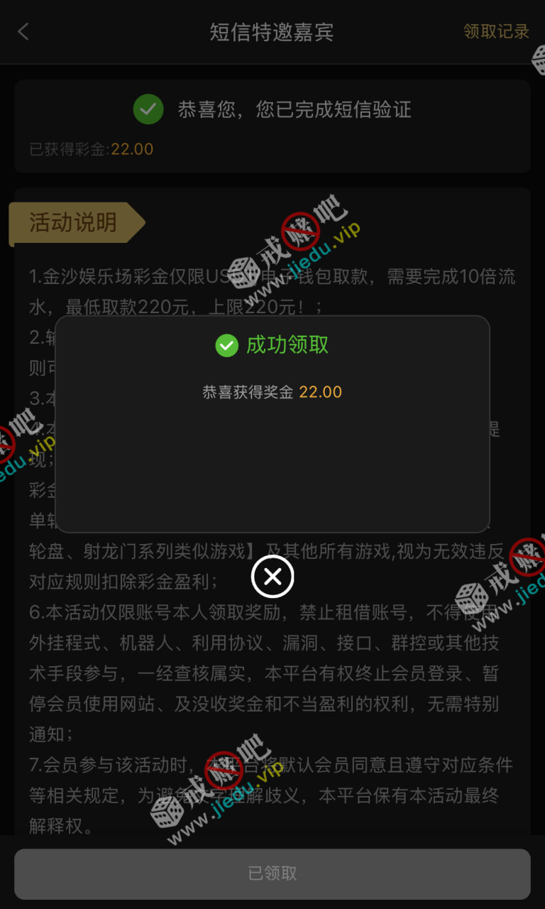 短信特邀彩金送了 22 ,有兴趣的老哥去弄弄!