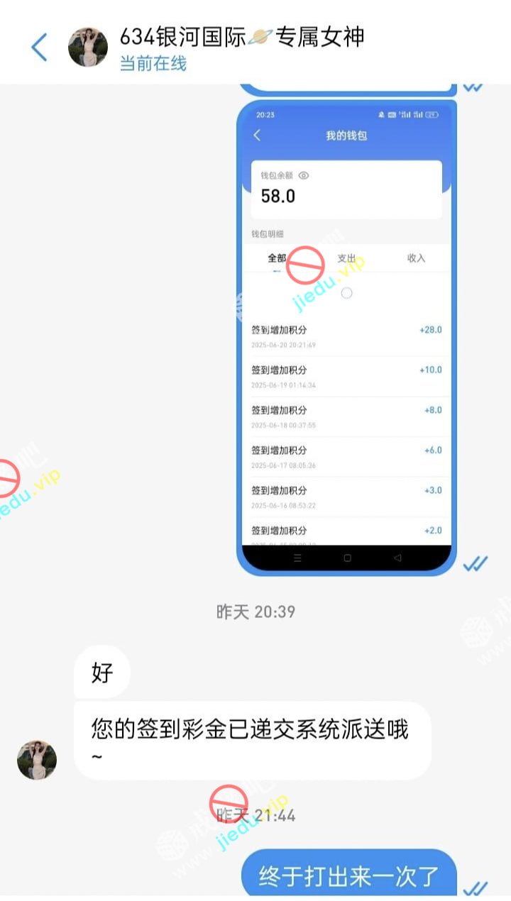 银河签到彩金 下载聊天软件找客服要, 每个星期签到 ,送58我领了好几个星期了就昨天打出来.